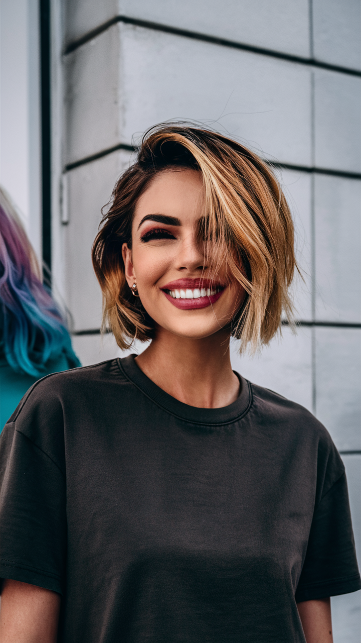 This playful, layered bob combines honey warm blonde highlights with a rich brown base. The asymmetrical cut and side-swept layers add dimension and structure. A vibrant choice for brunettes exploring a brighter and fresher hairstyle.