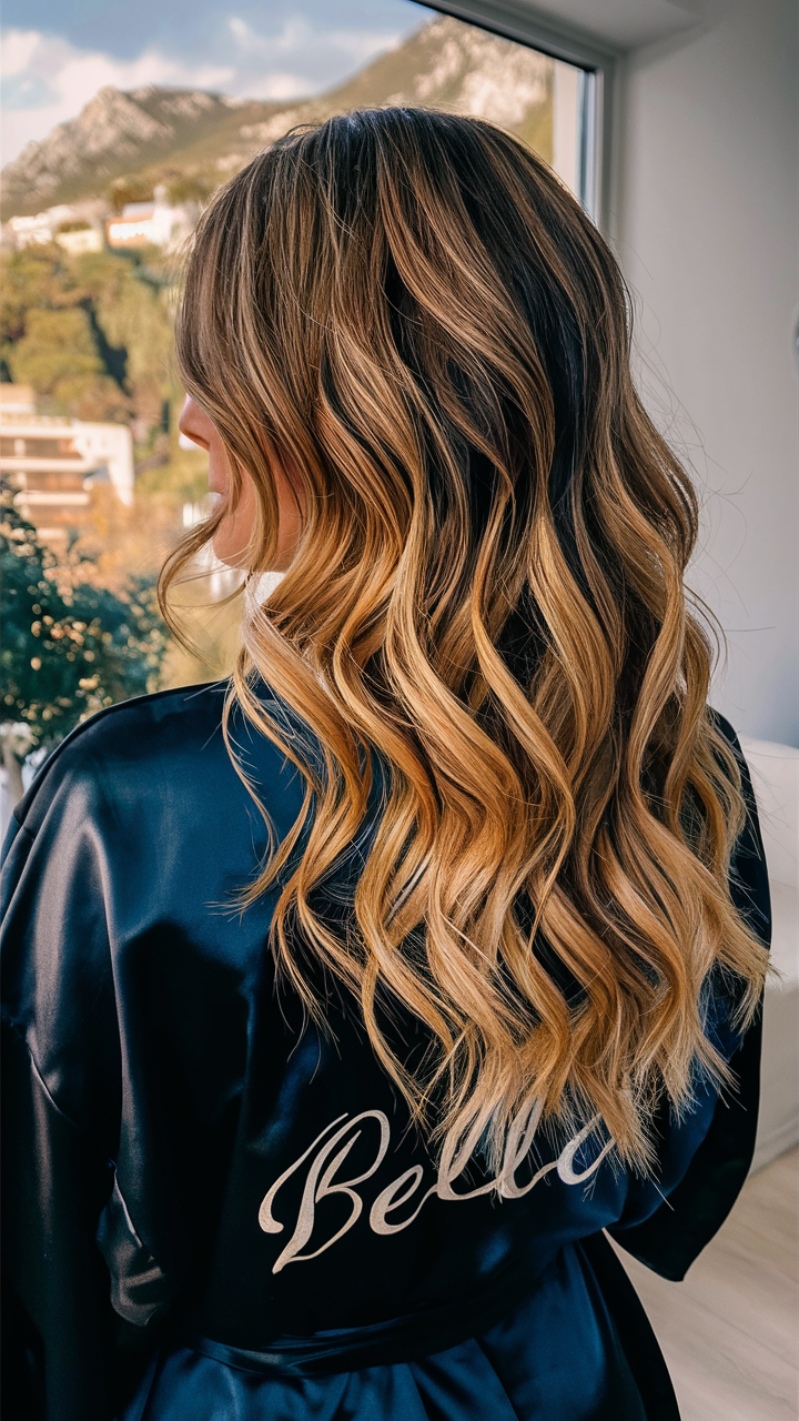 Long, cascading waves with honey caramel highlights frame the face and add warmth to the style. The luminous blend transitions seamlessly from dark roots, creating a glamorous yet natural finish. Ideal for a bold, sophisticated look for women embracing golden hues.
