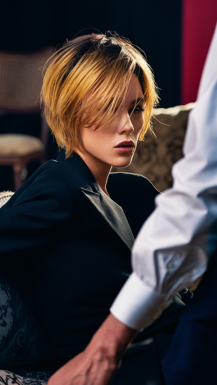 A chic pixie cut featuring honey warm blonde highlights on a dark root base. The asymmetrical layers add movement and texture, giving it a bold and modern vibe. Perfect for those wanting a low-maintenance yet striking hairstyle.