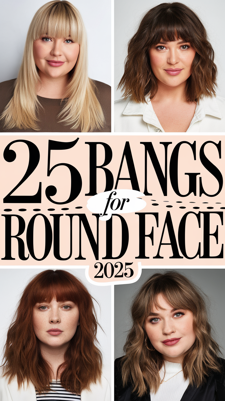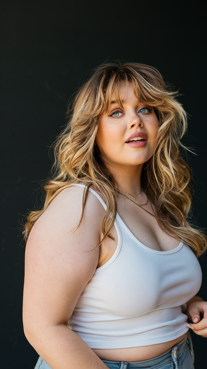 This look features luxurious blonde waves paired with full curtain bangs for a polished appearance. The layers flow effortlessly, creating volume and framing the face beautifully. This classic yet modern style is perfect for round faces seeking elegance and balance.