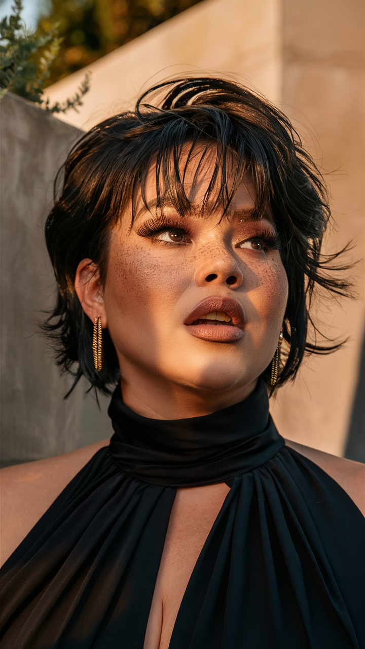 This short, textured pixie cut is complemented by choppy bangs for an edgy, modern look. The dark color emphasizes the clean lines of the cut, making it bold and eye-catching. Perfect for round faces, this hairstyle offers low-maintenance sophistication.