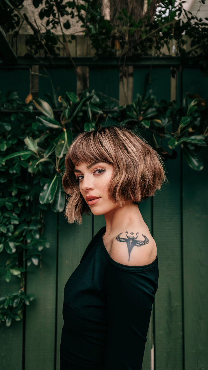 This chin-length bob combines warm brunette tones with soft waves, offering a classic yet playful style. The addition of light layers and a fringe enhances volume, making it perfect for thick hair or thick hair round faces. It’s a trendy option for those looking to embrace natural texture in 2025.