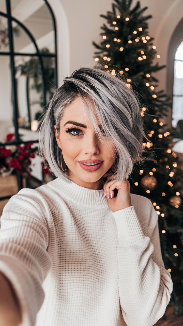 This choppy bob features silver tones and layered ends, creating a modern, edgy vibe. The side part adds volume and movement, making it ideal for fine hair or thin hair textures. It’s a bold, stylish option for 2025, perfect for adding dimension to short hairstyles.