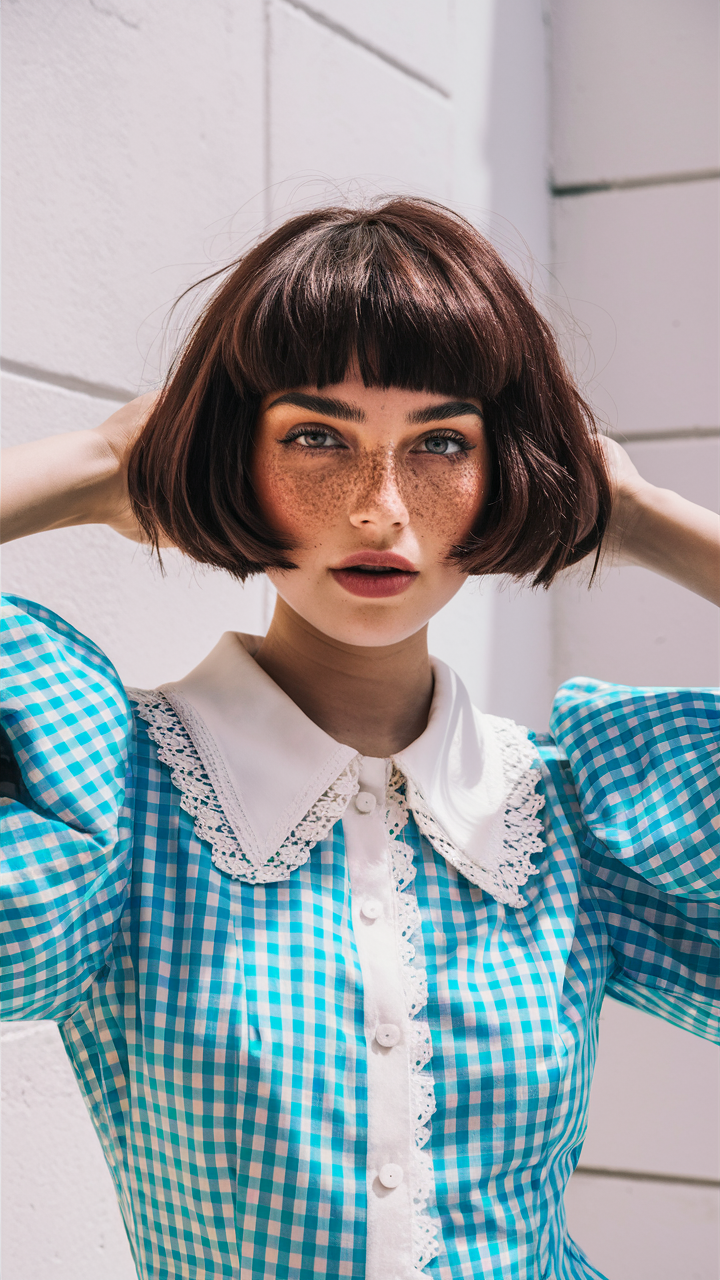 This chin-length bob is sleek and classic, enhanced by rich chocolate brown tones. The blunt bangs frame the face beautifully, making it a great choice for round faces or thick hair. It’s a timeless style with a modern edge that suits both casual and formal looks.