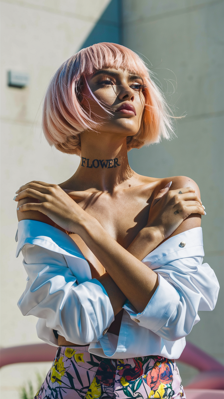 This pastel pink bob is strikingly modern with its sharp, precise cut and straight-across bangs. The soft peach tones in the color create an ethereal, dreamy effect that feels playful yet polished. Ideal for bold personalities, this look is both edgy and ultra-feminine.