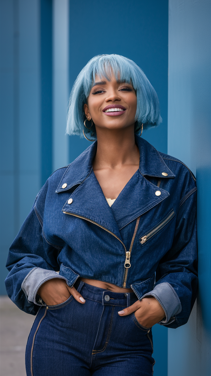 This icy blue bob with blunt bangs is a fresh, contemporary twist on bold hair trends. The cool-toned shade pops brilliantly against darker complexions, adding a futuristic feel. With its sleek cut and vibrant hue, this style radiates confidence and individuality.