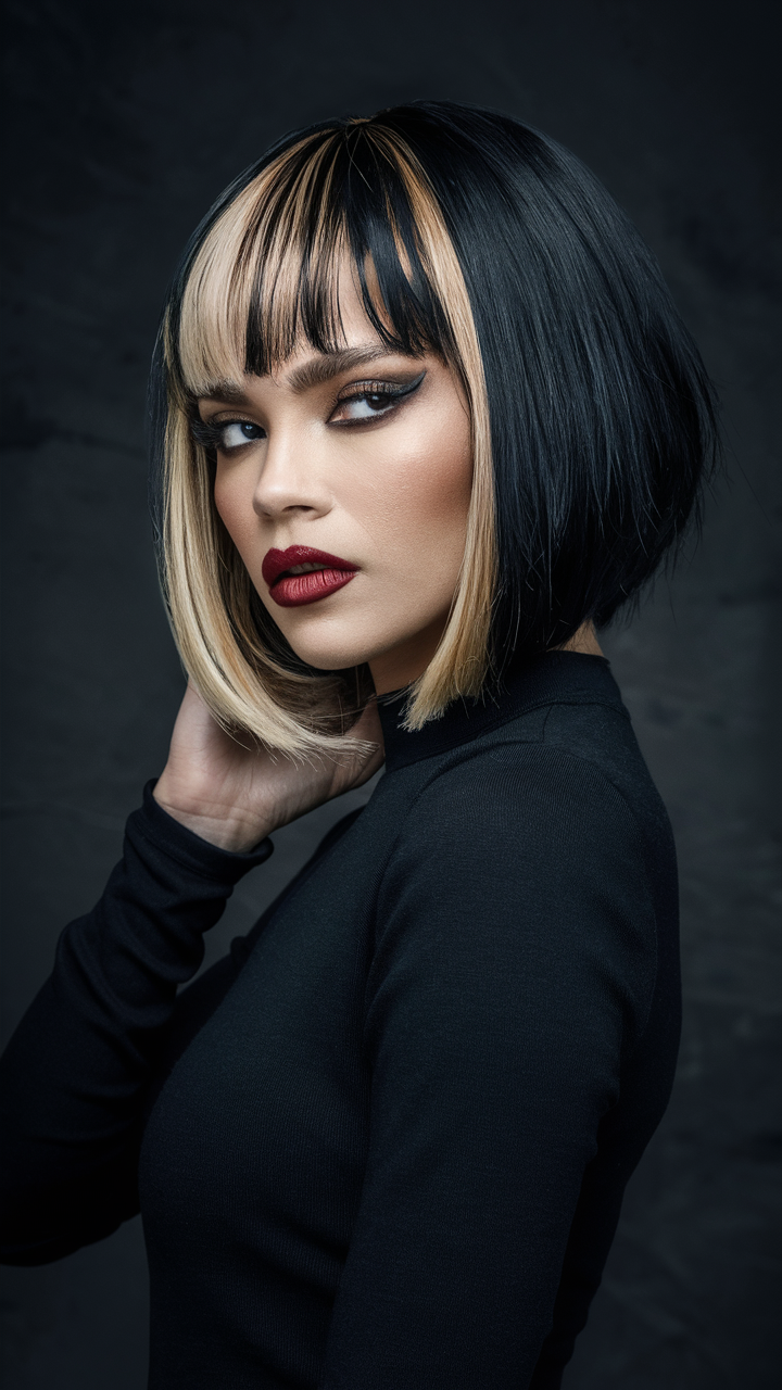This sharp, asymmetrical bob features a high-contrast blend of jet black and platinum blonde highlights. The straight fringe is structured with alternating colors, creating a bold and edgy effect. The precision cut enhances the sleekness of the style, perfect for those seeking a statement look.