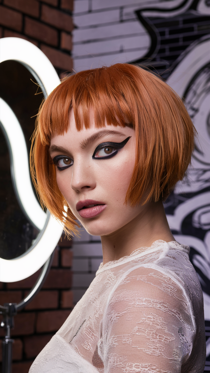 This hairstyle showcases a vibrant copper hue with a softly layered bob cut. The rounded shape and micro-fringe bring out the intensity of the color, complementing the face with a youthful and artistic vibe. This look is ideal for adding personality with minimal maintenance.