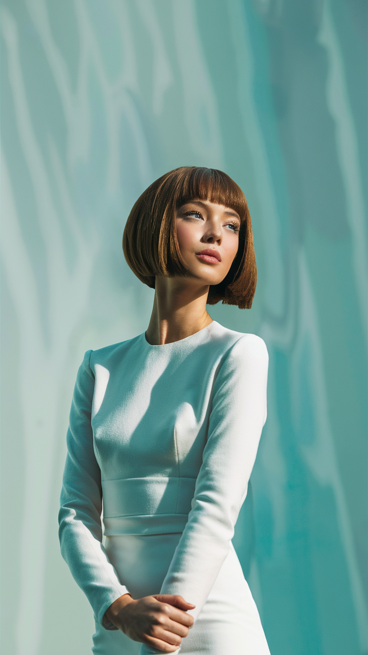 A timeless chocolate brown bob with a rounded silhouette and clean lines. The smooth finish highlights the richness of the color, while the soft bangs frame the face delicately. Perfect for a polished and sophisticated appearance that works for any occasion.