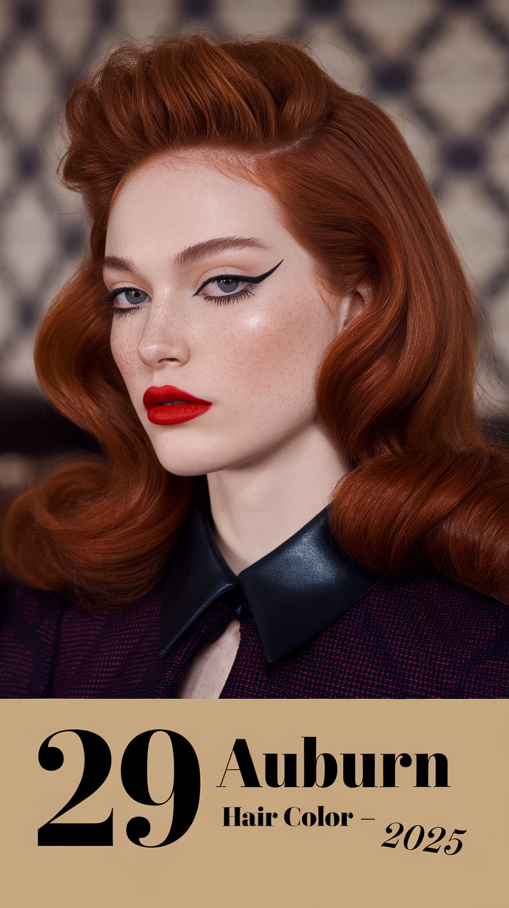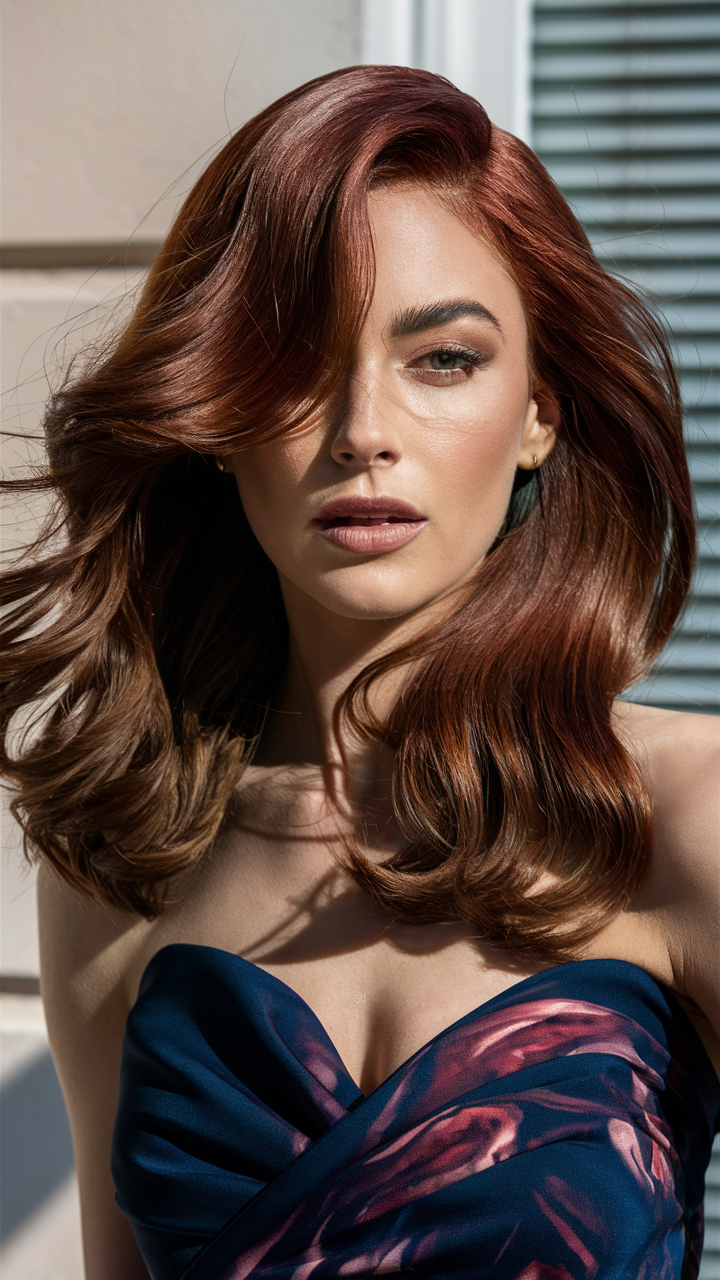 This hairstyle features soft, voluminous waves in a rich auburn shade with subtle dark brown lowlights. The glossy finish adds depth and enhances the warm reddish tones, making the hair appear vibrant and healthy. Perfect for an elegant and timeless look, this style is a standout for auburn hair color trends in 2025.