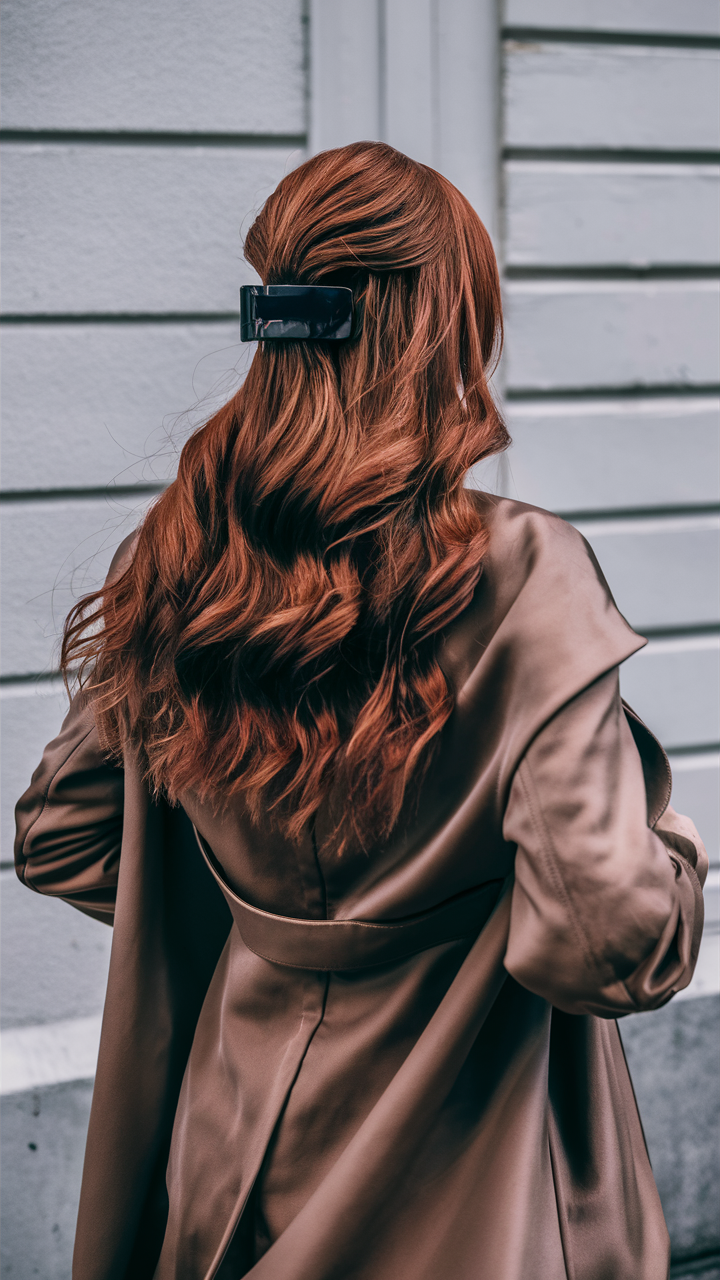 This half-up hairstyle showcases loose waves in a warm auburn shade with a natural, radiant finish. The reddish and golden hues add dimension, while the soft waves give the look a relaxed yet refined vibe. Perfect for casual or formal settings, this style embraces the richness of auburn hair color beautifully.