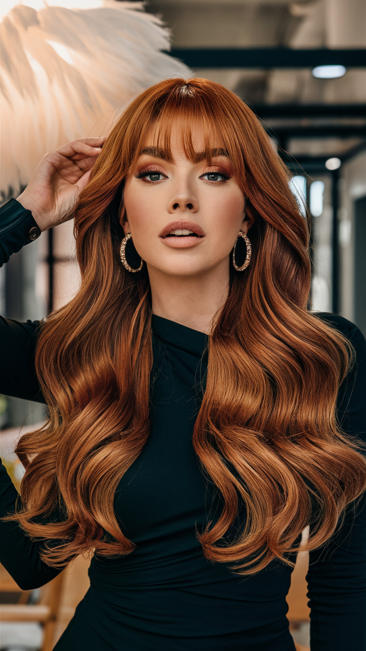 This hairstyle features long, flowing auburn waves complemented by a soft curtain fringe. The reddish and golden undertones create a luminous, warm glow, perfect for enhancing natural beauty. This elegant and versatile style is ideal for both casual and formal settings.