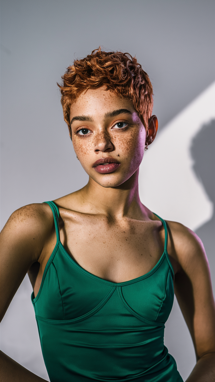 This short, textured pixie cut is infused with vibrant ginger auburn tones, creating a fresh and youthful look. The soft layers and tousled finish emphasize the warm reddish hues, making the hair appear lively and dynamic. Perfect for those seeking a low-maintenance yet bold style, this cut showcases the beauty of auburn hair color for 2025.