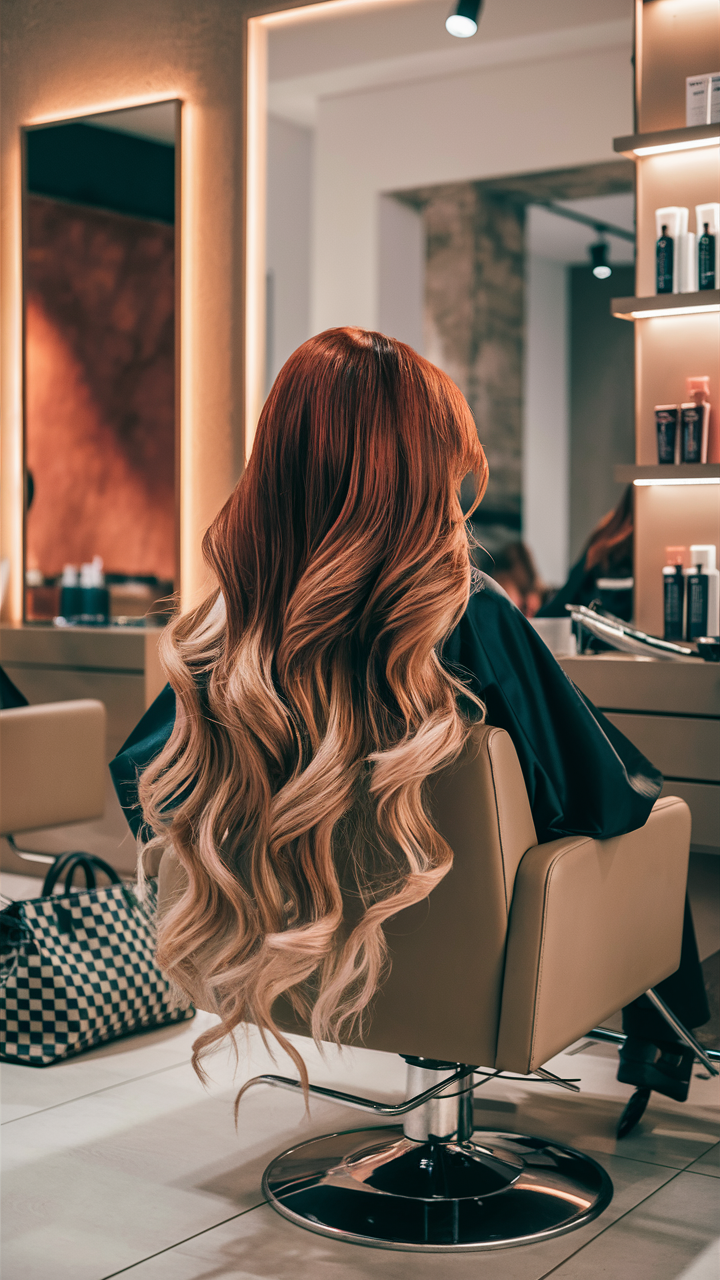 A beautiful auburn ombre transitions seamlessly into golden-blonde ends, creating a striking gradient effect. The rich dark brown base blends with warm reddish and copper tones, adding depth to the look. This hairstyle is perfect for a bold, modern take on classic auburn hair ideas for 2025.
