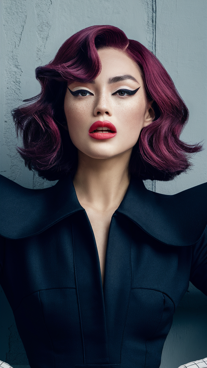 This retro-inspired hairstyle features soft curls in a deep auburn and burgundy blend. The dark red tones add depth and drama, while the smooth, structured waves give a polished vintage appeal. Ideal for an elegant and timeless look, this style brings classic glamour to the forefront.
