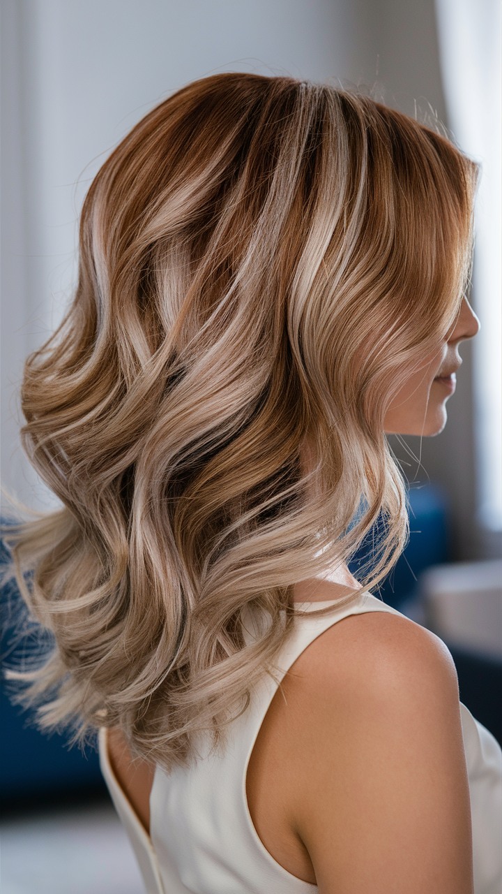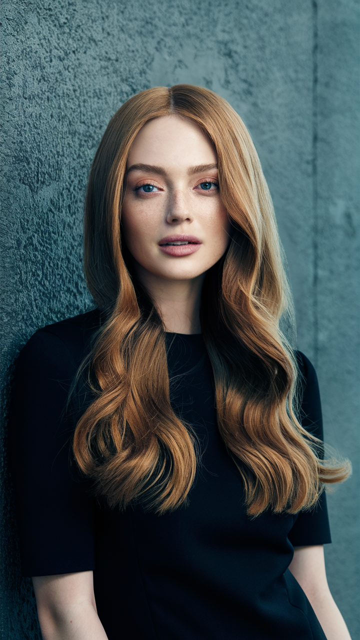 This look features a soft auburn balayage that blends effortlessly into blonde tones for a luminous finish. The warm reddish-brown base adds depth, while the lighter highlights create a natural, sun-kissed effect. Perfect for a relaxed and elegant style, this hair color transition suits a variety of occasions.