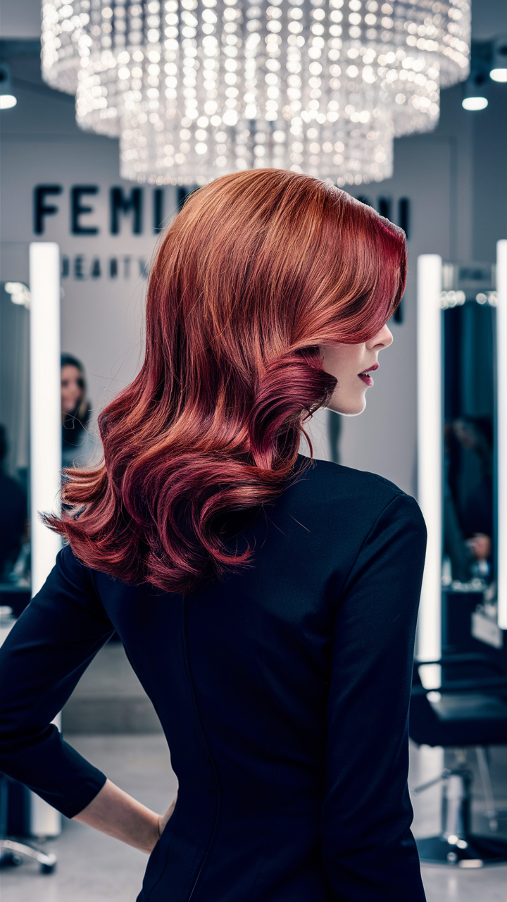 This stunning hairstyle combines deep burgundy and auburn waves with a luminous, glossy finish. The soft waves and reddish undertones create a vibrant and dynamic look. Perfect for evening events, this style radiates sophistication and boldness.
