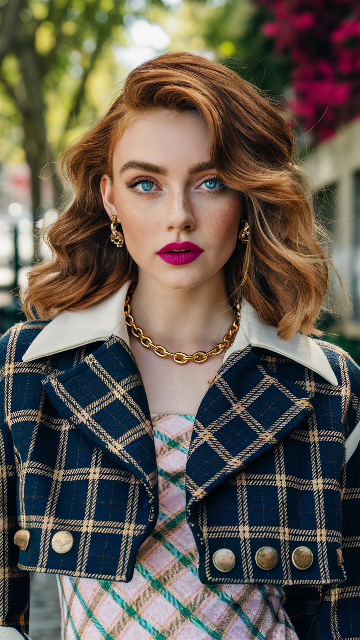 This polished hairstyle features sleek auburn locks styled with retro-inspired flipped ends. The rich copper tones give the hair a radiant glow, while the smooth finish adds elegance. This look is perfect for a classic yet modern take on auburn hair color trends.