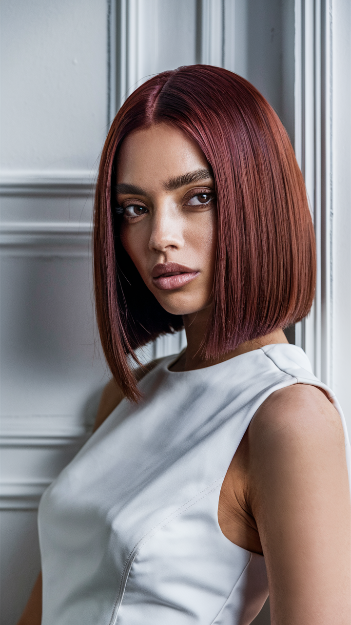 This hairstyle features a sleek auburn bob with a sharp, precise cut. The reddish undertones and glossy finish create a polished and modern look. Ideal for a sophisticated and professional style, this cut highlights the beauty of simplicity.