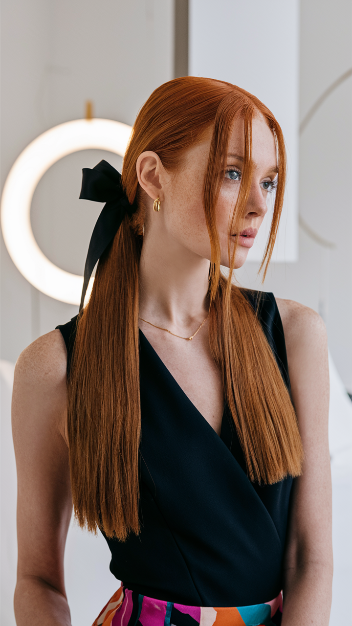This charming look features long, straight auburn pigtails tied back with black ribbon accents. The warm, reddish tones add richness, while the center-parted bangs frame the face softly. This style is perfect for creating a delicate and timeless aesthetic.