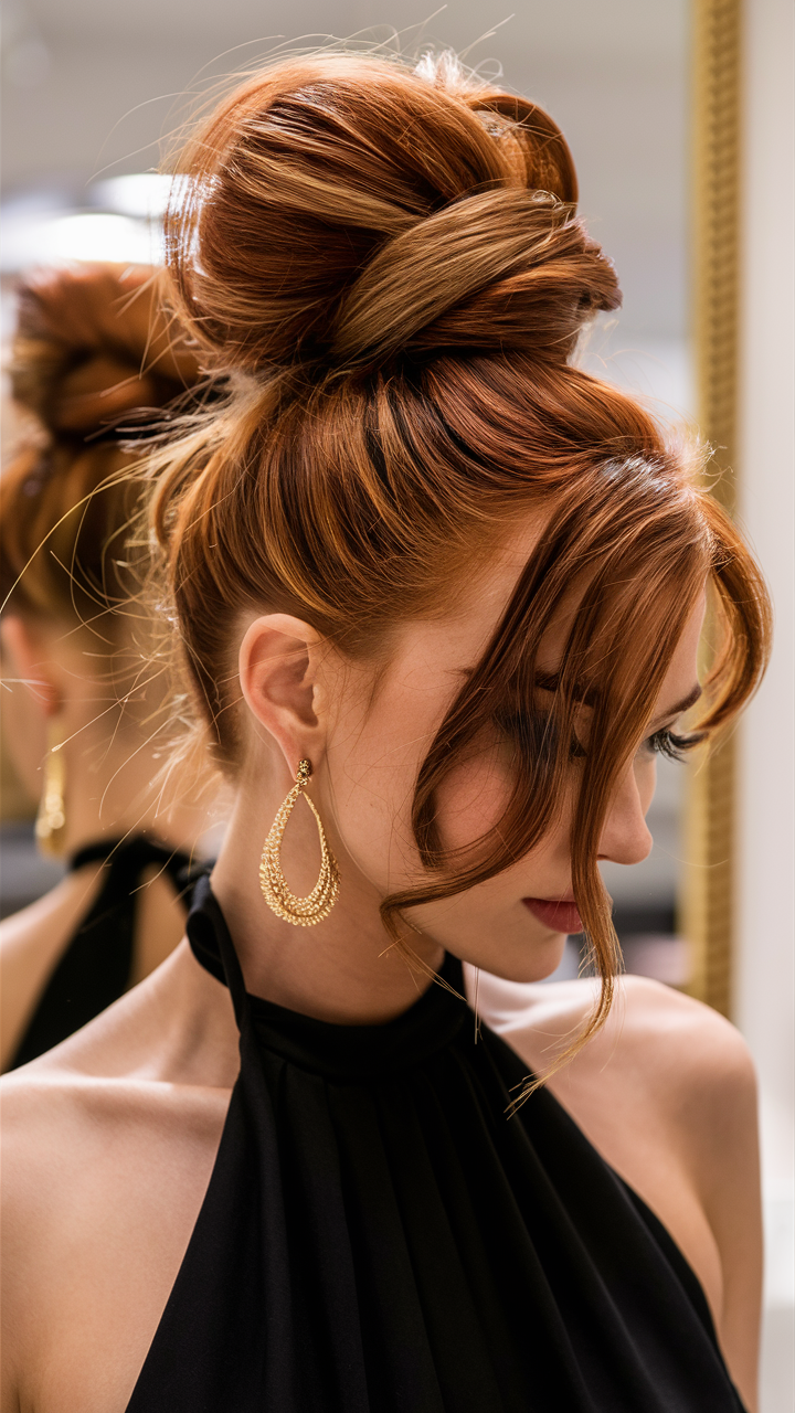 #1 Messy Auburn Top Knot with Curtain Bangs