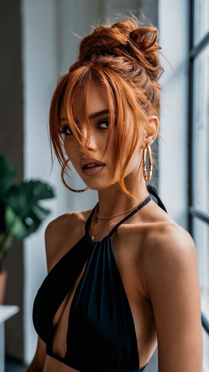 This top knot blends a warm ginger-auburn hue with effortless, wispy strands. The loose, face-framing curtain bangs soften the overall look, adding a playful and relaxed vibe. Perfect for casual settings, this hairstyle balances modern style with approachable charm.