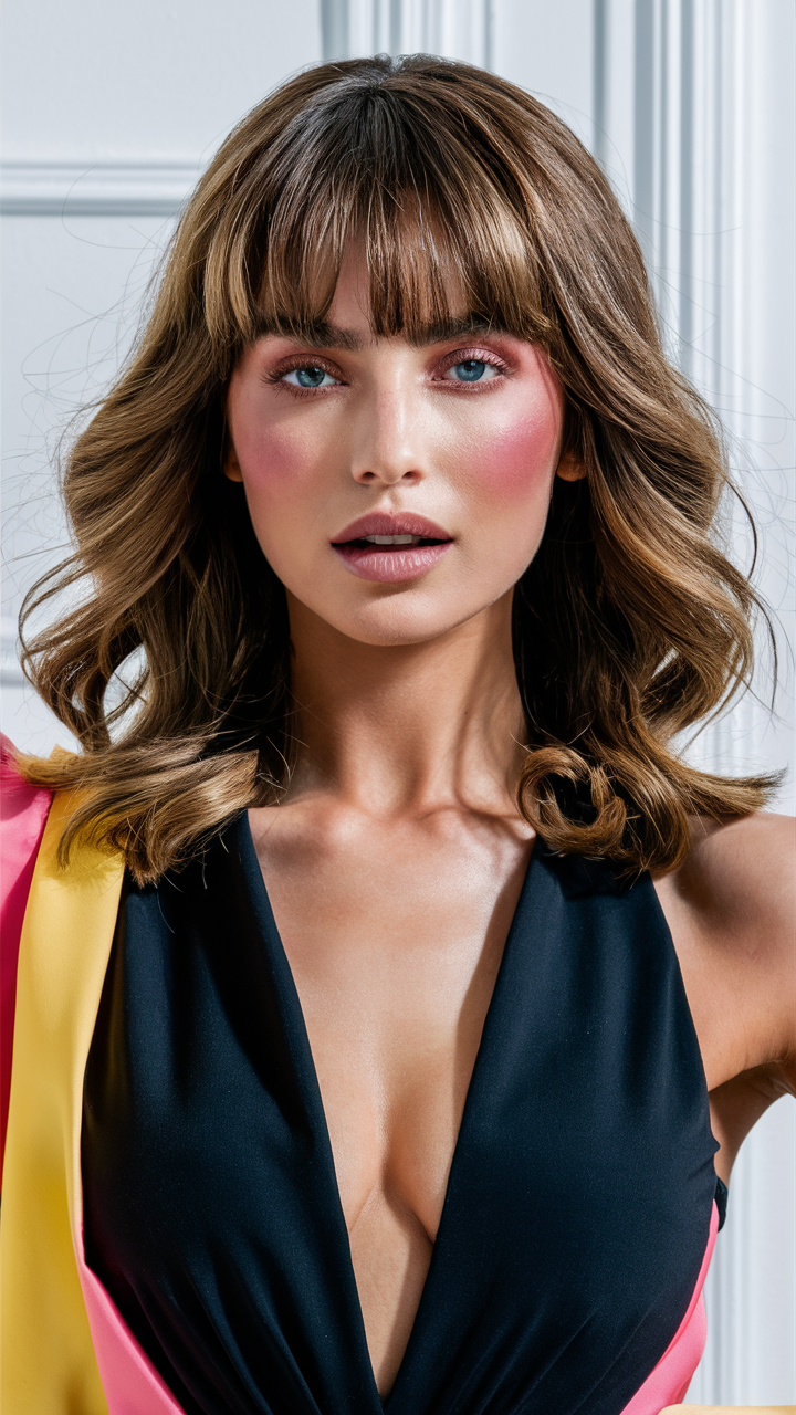 This modern style combines mid-length layers with textured curtain bangs and subtle honey-blonde highlights. The waves add movement, while the bangs draw attention to the eyes, creating a flattering face-framing effect. Perfect for women who want an effortlessly chic look, this hairstyle complements a variety of hair textures.