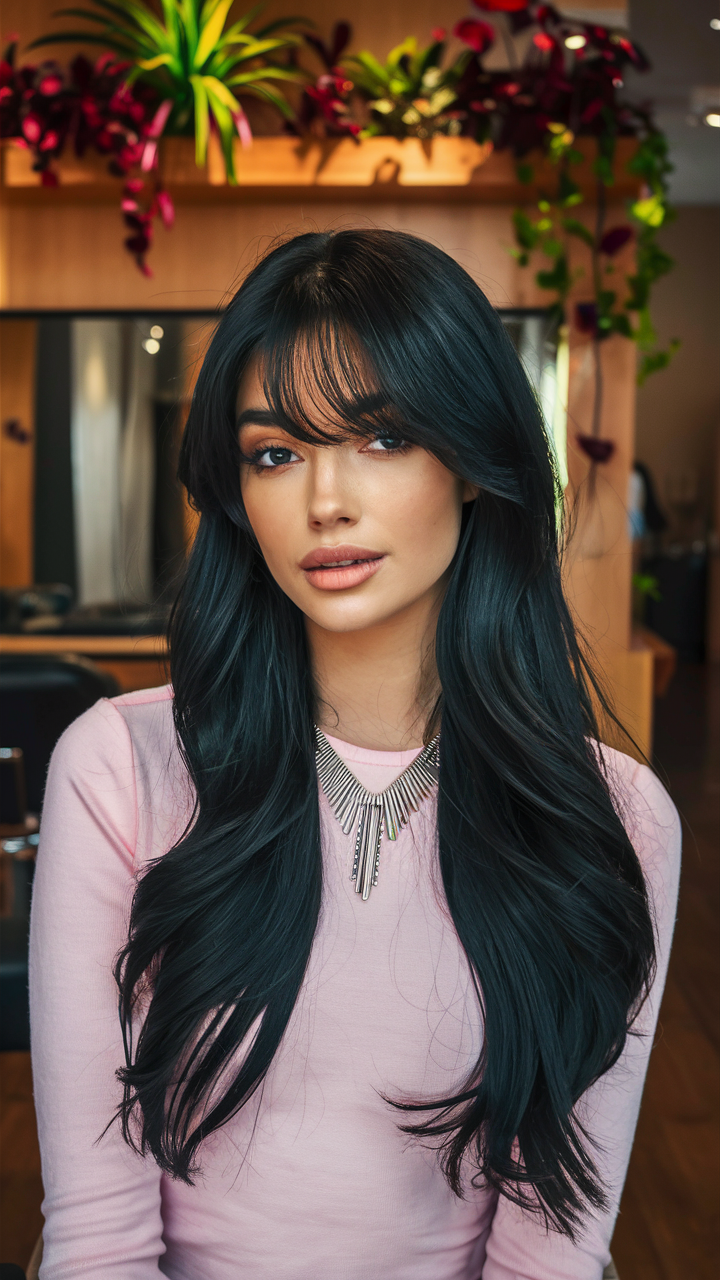 Elegant and polished, this style highlights long, straight hair paired with soft curtain bangs that frame the face beautifully. The jet-black tone enhances the hair’s shine, creating a sleek and sophisticated appearance. Perfect for oval-shaped faces, this look is timeless and versatile for any occasion.