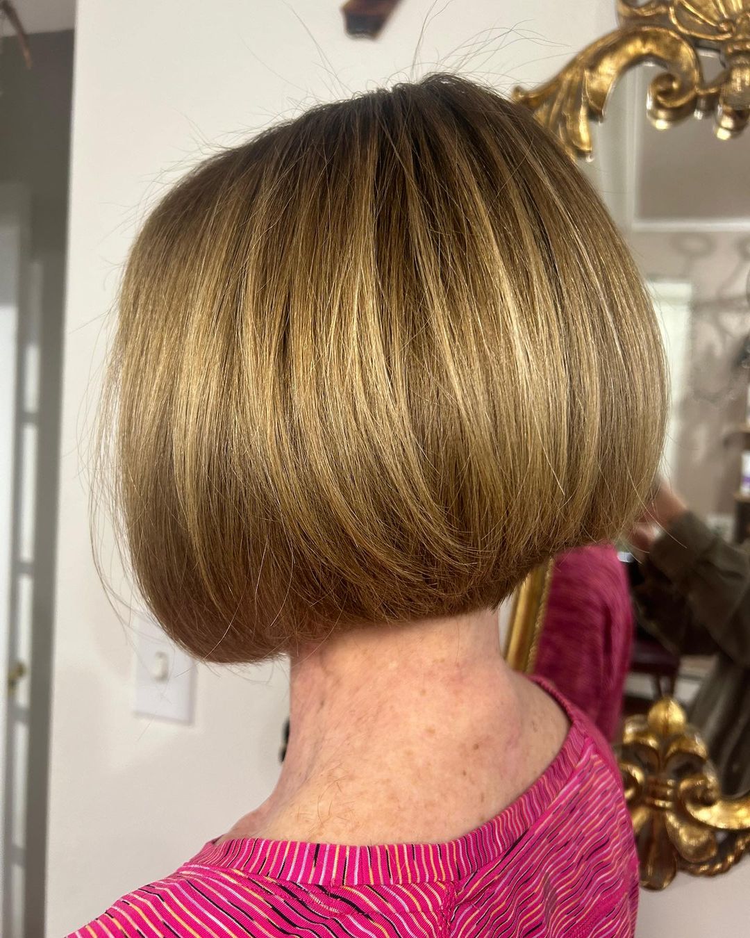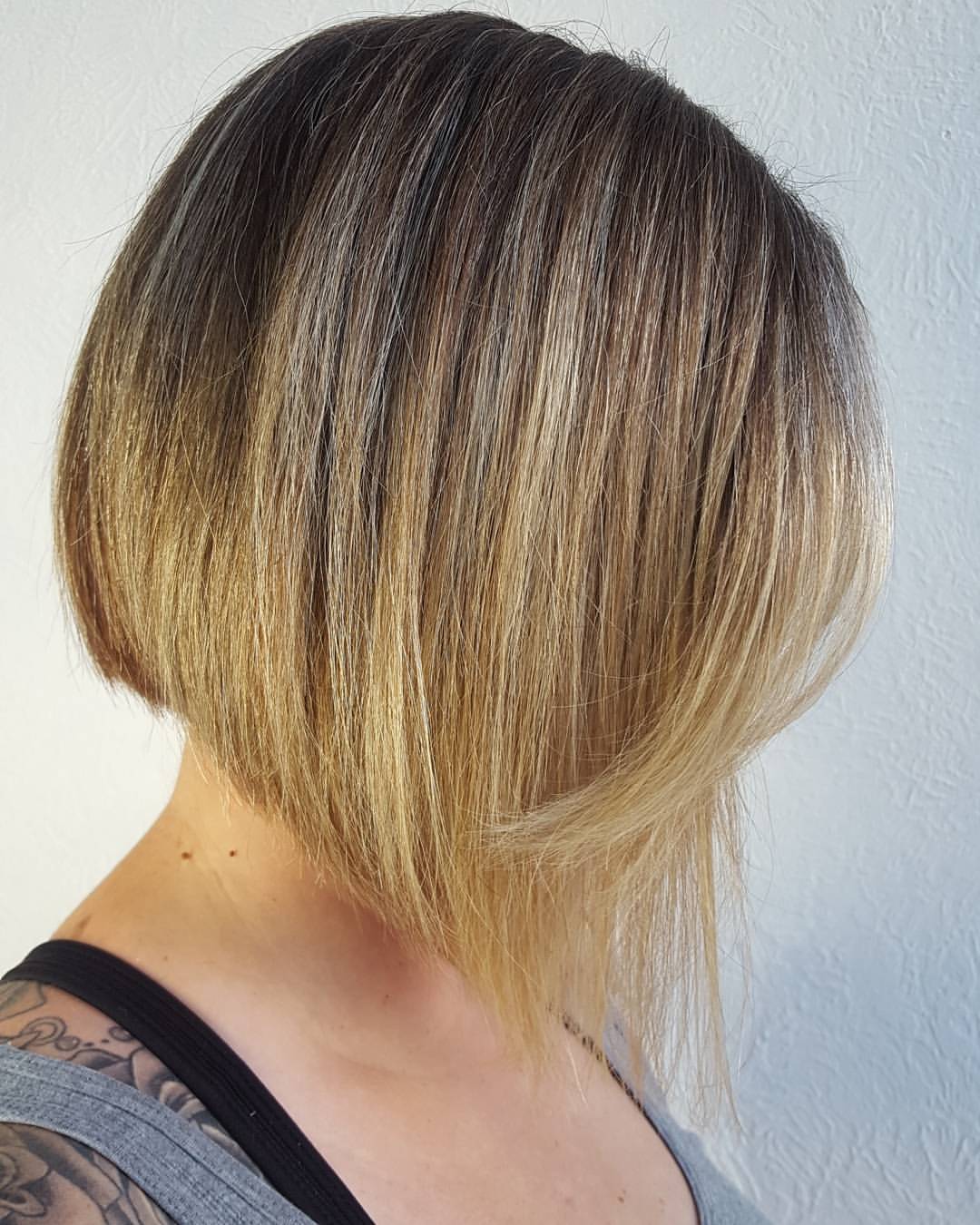 This angled bob features a sharp graduation that creates a clean and modern silhouette. The blonde tones are enhanced with subtle highlights, adding depth and dimension. Its medium length makes it perfect for fine or straight hair, offering a polished finish.