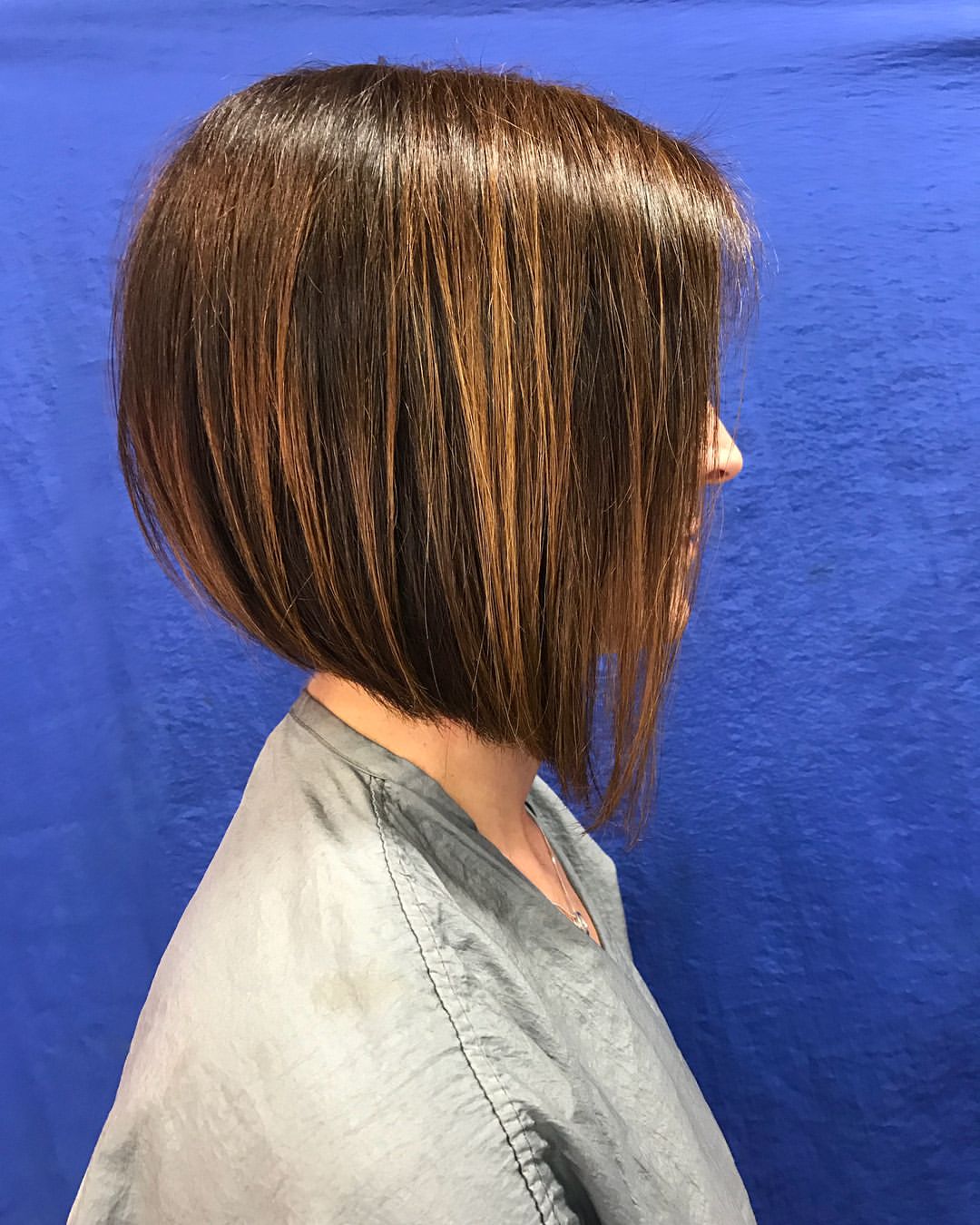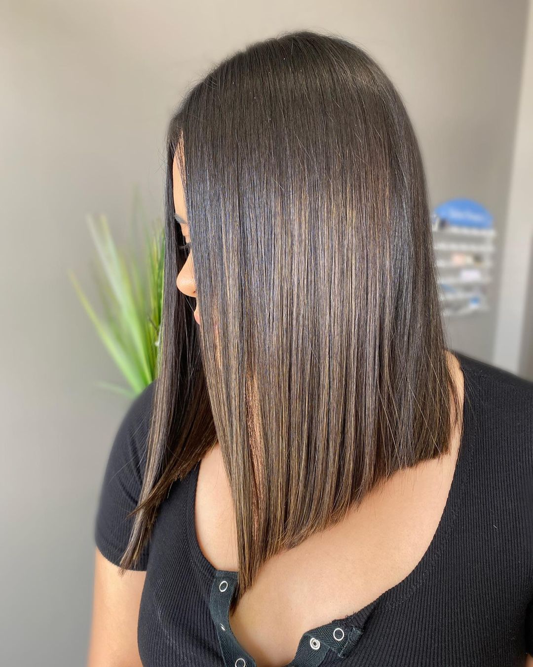 This chocolate brown angled bob showcases a sharp, precise cut that accentuates its glossy texture. The sleek finish works beautifully for straight hair, enhancing the richness of the dark tone. Its medium length provides a professional and elegant look for 2025.