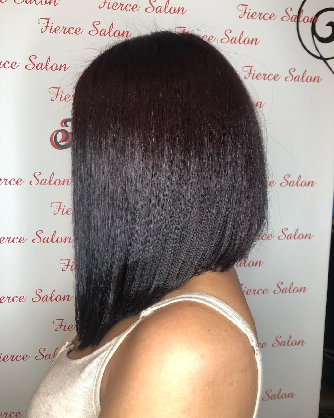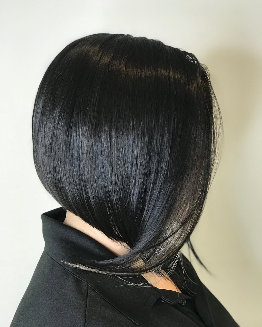 This sleek black angled bob features a sharp, asymmetrical cut that creates a bold and striking silhouette. The glossy, straight texture enhances the clean lines and gives it a high-fashion look. Ideal for thick hair, the dramatic edges make it a standout style for 2025.