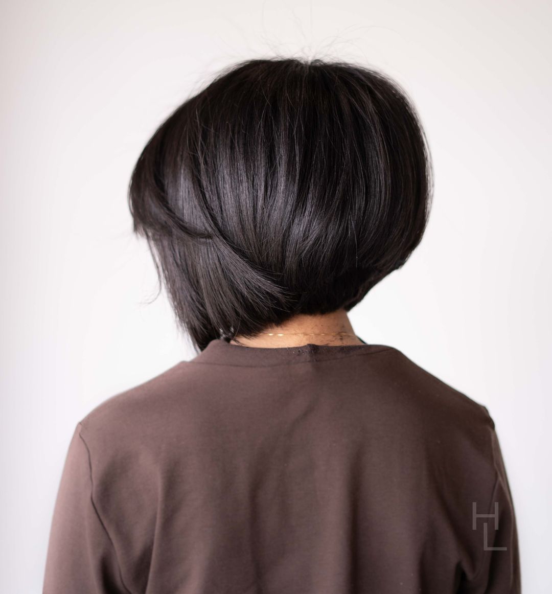 This layered stacked bob is tailored for thick hair, creating a rounded and voluminous shape. The rich black color complements the texture, adding depth and dimension to the cut. Its short, structured finish is perfect for a polished and effortless appearance.