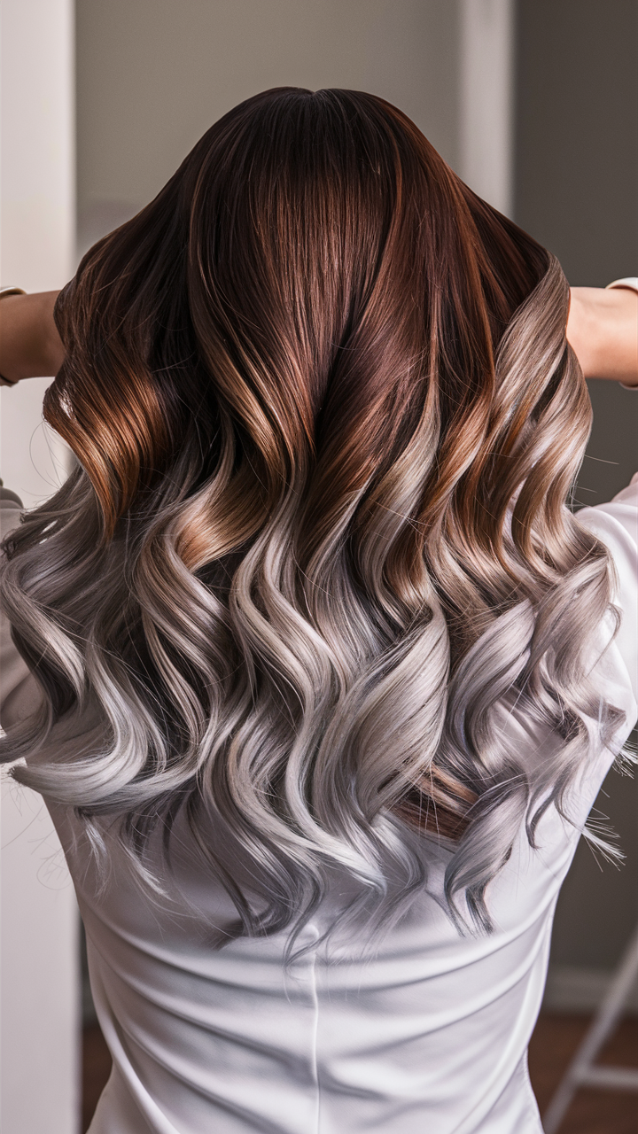 This style transitions smoothly from brunette roots to grey and silver ends, creating a striking ombre effect. The chunky highlights add texture to the waves, making the grey hair look dynamic and voluminous. It’s a low-maintenance option with a modern, edgy finish.