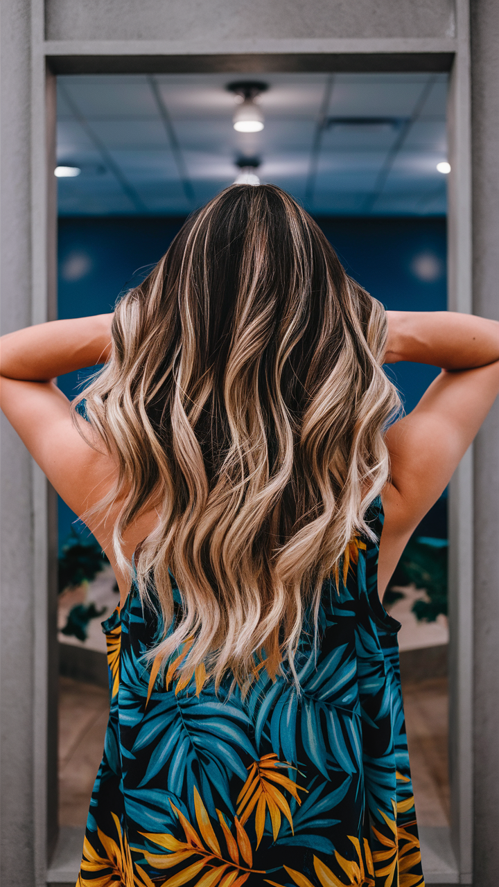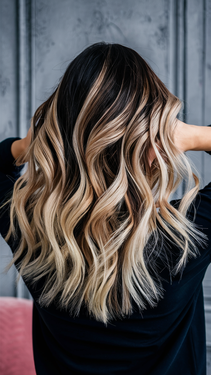 These voluminous waves showcase light blonde highlights interwoven with dark lowlights to add dimension and movement. The blended highlights create a soft, sun-kissed effect, making this look ideal for those who prefer a low-maintenance style with brunette undertones. It adds texture and brightness without overwhelming the natural roots.