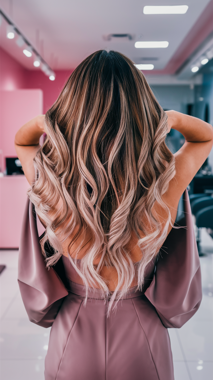 These cascading waves showcase a beautiful soft blonde balayage on a dark base, giving a sun-kissed effect. The light blonde tones add brightness, while the natural roots keep the style low-maintenance. Perfect for achieving a graceful, flowing look with a hint of elegance.