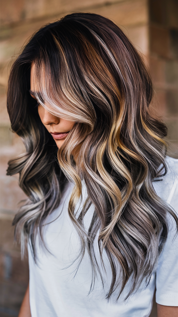 This look combines dark brown hair with strategically placed ash blonde highlights for a soft, dimensional effect. The highlights add contrast and brightness to the natural brown base, giving the style a sun-kissed finish. Ideal for a subtle yet striking blended highlights 2025 approach.