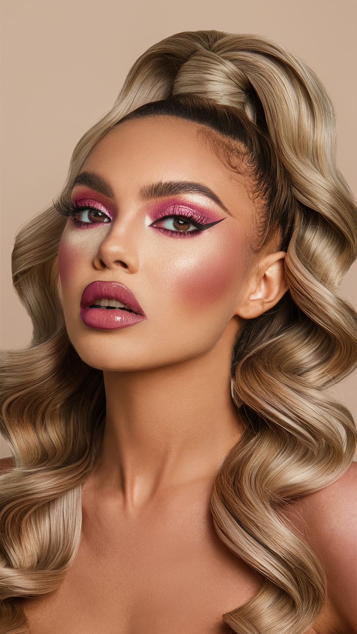 The voluminous waves in this style emphasize a platinum blonde shade, giving it a luxurious, retro-inspired finish. The smooth, shiny curls add elegance, making it an ideal choice for those who love a classic, high-glamour look. The light blonde tones enhance the skin tone, creating a radiant overall effect.