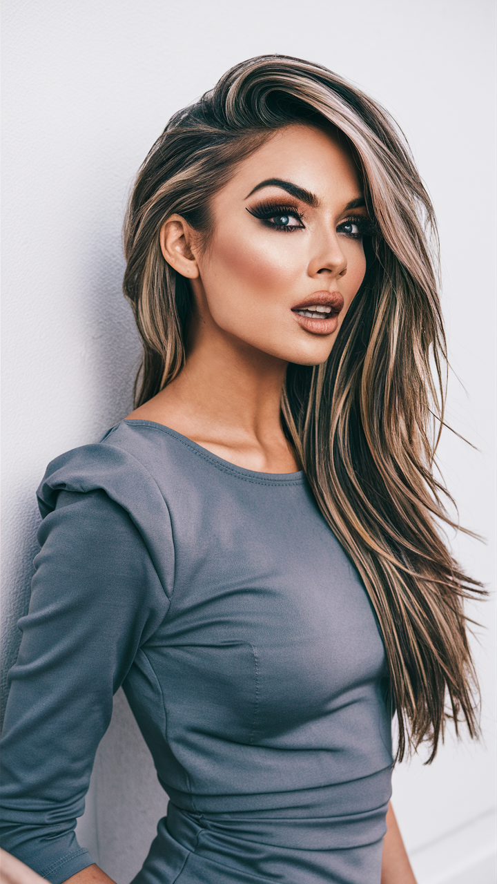 Long, sleek layers are accentuated by bold, dimensional highlights, seamlessly blending blonde tones into the brunette base. The highlights create a striking contrast, giving the overall style a refined yet edgy look. Ideal for those who want a high-impact style.