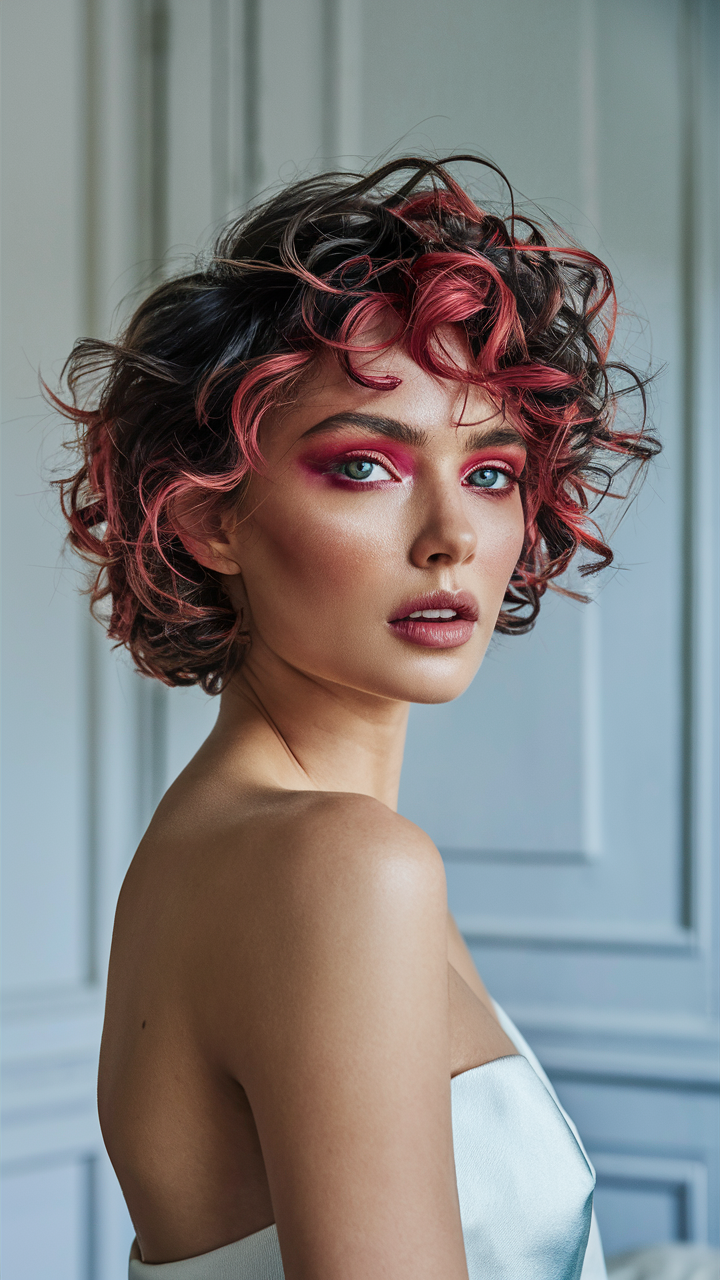 This chic, curly bob combines dark roots with a vibrant mix of pink and red highlights. The defined curls make the highlights pop, adding a playful, artistic vibe to the look. A bold choice for anyone looking to make a statement with short, textured hair.