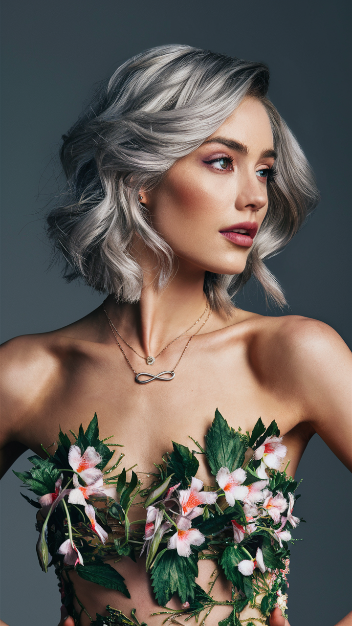 This hairstyle showcases a chic bob cut in a stunning silver hue, perfect for adding a sophisticated edge. The waves add body and volume, creating an airy, feathered effect that enhances the cool-toned color. The dimensional tones within the silver bring depth, making this look ideal for those who want a bold, elegant vibe.