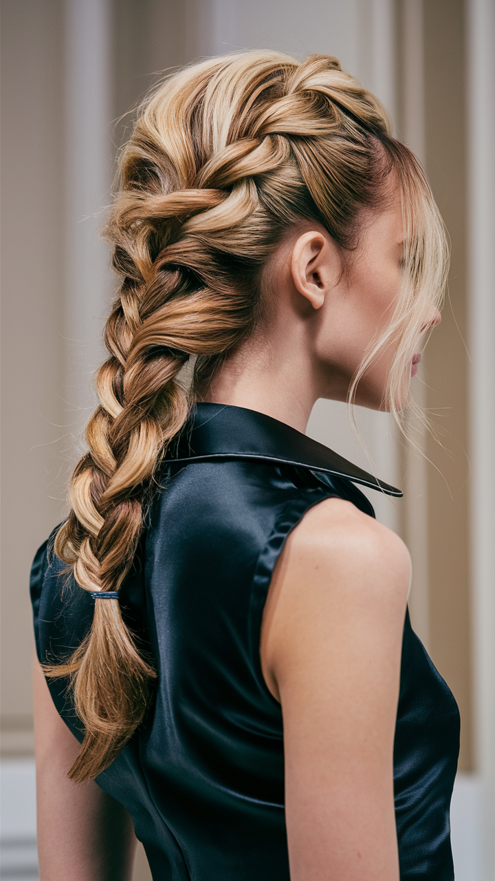 This intricate French braid updo combines artistry and structure, ideal for a formal or statement look. The light blonde shade throughout the braid creates a beautiful contrast with the darker roots, adding depth and dimension. The thick, voluminous braid is both bold and feminine, emphasizing a structured yet relaxed vibe.