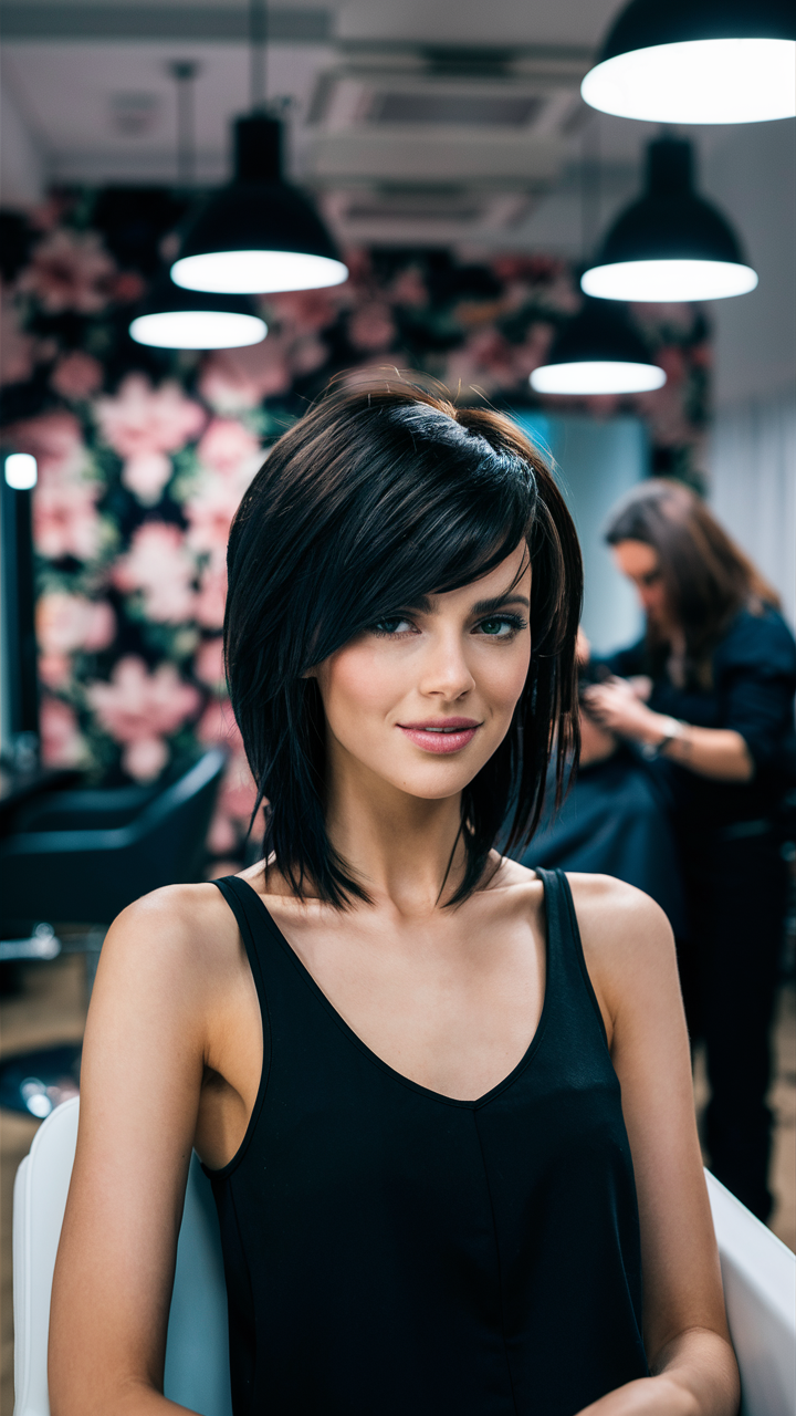This sleek, dark bob is layered to add texture and volume, complemented by side-swept bangs that frame the face. The angled layers create a polished, structured look. It’s an ideal choice for those wanting a sophisticated yet modern hairstyle.