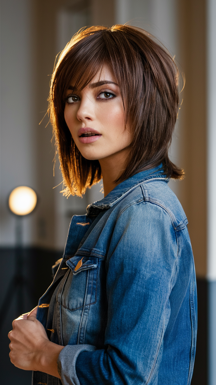 This sleek brown layered cut is complemented by side-swept bangs for a polished look. The layers create subtle volume and frame the face gracefully. It’s a chic, versatile choice that adds sophistication to any outfit.