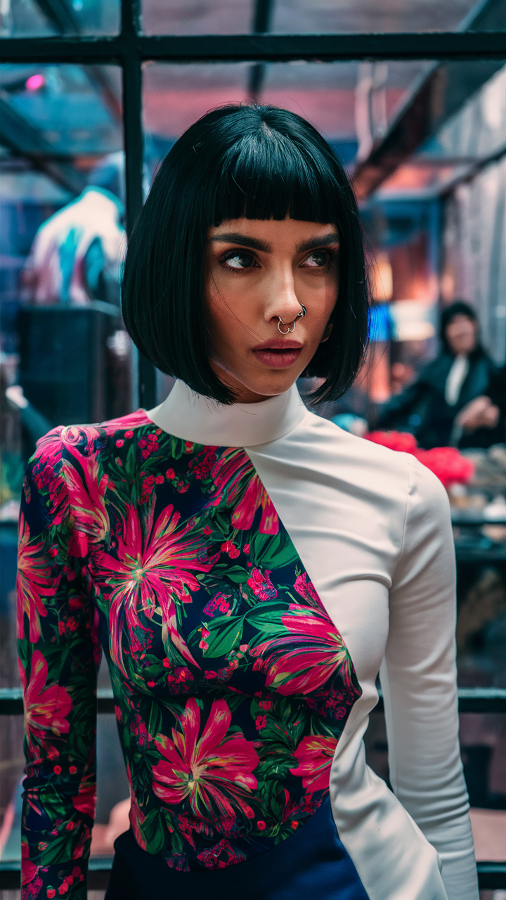 This edgy French bob has sharp, blunt edges and thick bangs that highlight a square face. The straight lines and jaw-length cut give it a modern, structured appearance. Perfect for anyone seeking a bold, statement haircut.