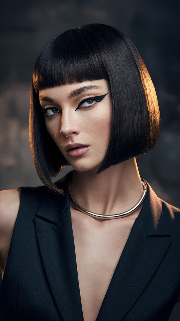 This glossy black French bob has a jaw-length cut with blunt, straight-across bangs that create a striking look. The sharp cut emphasizes a diamond or long face shape, adding a refined edge to the style. Perfect for those seeking a bold, classic aesthetic in 2025.