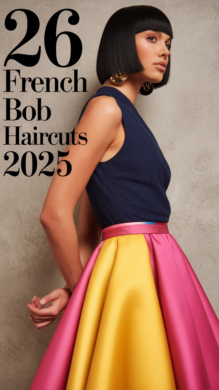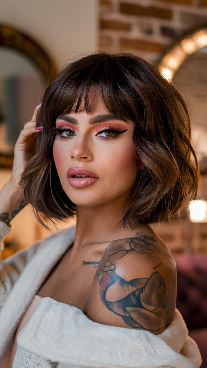 This tousled brunette bob features soft, wispy bangs that enhance its relaxed, effortless vibe. The loose waves create volume, making it a great choice for fine or thin hair. This cut flatters a variety of face shapes, adding a playful, feminine touch to the French bob.