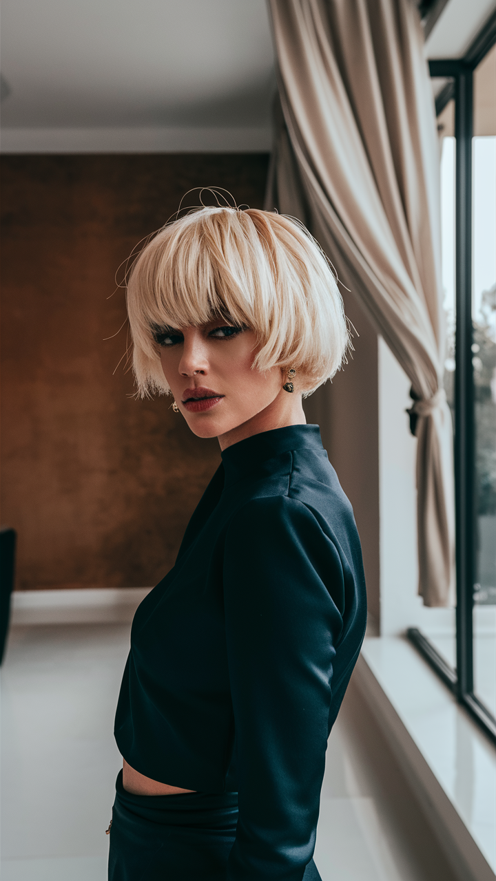 This sleek, chin-length bob has a blunt cut with straight, full bangs, giving a polished, modern appeal. The platinum blonde shade complements the sharpness of the cut, adding elegance to a round face. This style is perfect for a minimalist, high-fashion vibe.