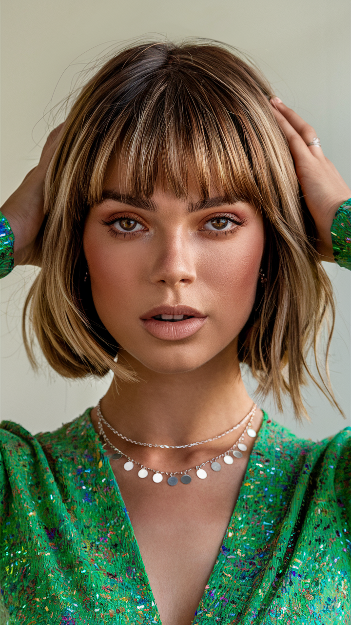 This tousled bob features wispy bangs that soften the face, creating a relaxed, effortless look. The subtle highlights add depth to the warm brown shade, ideal for enhancing a round or oval face. Perfect for a natural, carefree style with a touch of elegance.