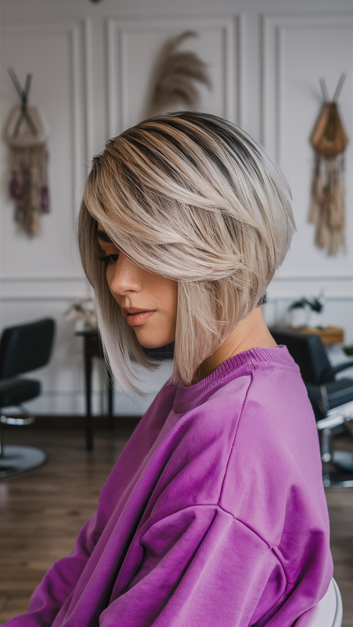 This asymmetrical bob showcases side-swept bangs and a longer front, adding drama and sophistication. The cool blonde shade with darker roots enhances the layered texture, making it perfect for a modern, edgy style. Ideal for those wanting a trendy look with a bit of flair.
