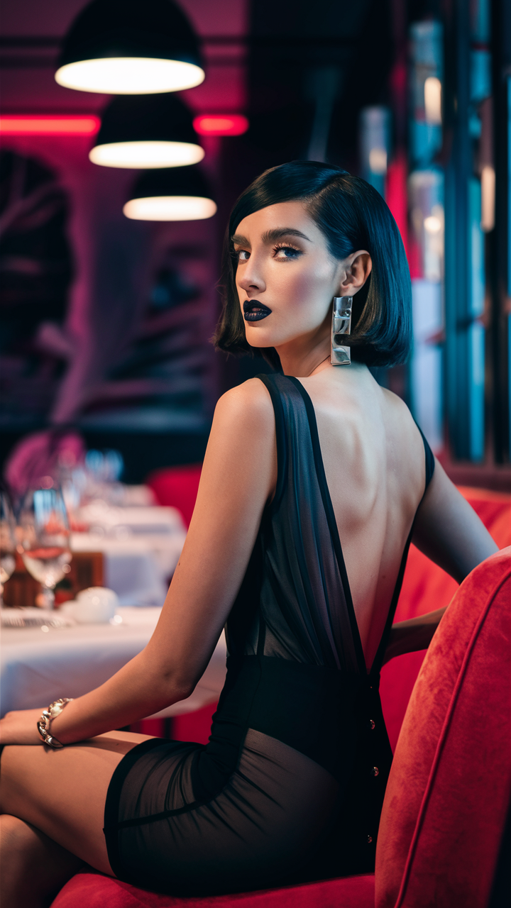 This sleek, dark bob features a sharp side part, adding sophistication and edge to the style. The glossy black color enhances the hair’s smooth texture, perfect for a polished, evening look. Ideal for those wanting a bold, dramatic hairstyle with a modern twist.